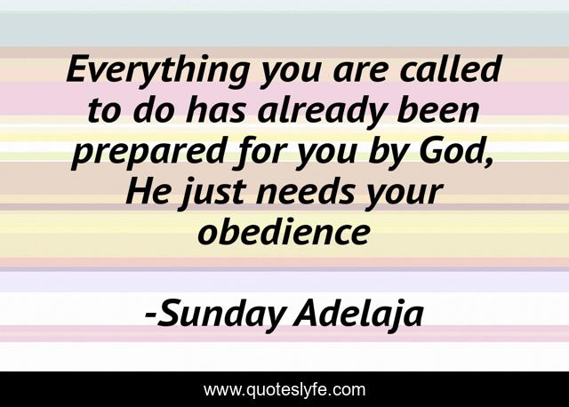This page presents the quote "Everything you are called to do has already been prepared for you by God, He just needs your obedience". Author of this quote is Sunday Adelaja. This quote is about god, obedience, calling, preparation, purpose, fulfillment,.
