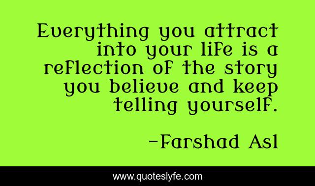 This page presents the quote "Everything you attract into your life is a reflection of the story you believe and keep telling yourself.". Author of this quote is Farshad Asl. This quote is about yourstory, leadership, self-talk, belief, self-leadership,.