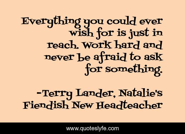This page presents the quote "Everything you could ever wish for is just in reach. Work hard and never be afraid to ask for something.". Author of this quote is Terry Lander, Natalie's Fiendish New Headteacher. This quote is about life, help, wish, work, wishes, dreams,.
