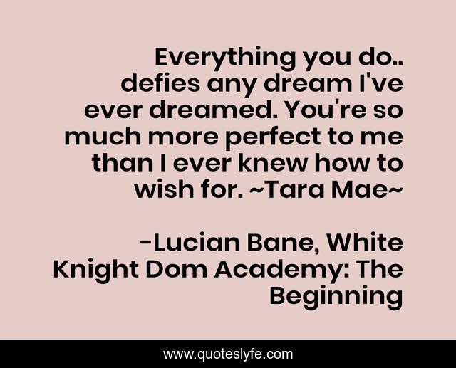 This page presents the quote "Everything you do.. defies any dream I've ever dreamed. You're so much more perfect to me than I ever knew how to wish for. ~Tara Mae~". Author of this quote is Lucian Bane, White Knight Dom Academy: The Beginning. This quote is about true-love, wife-and-husband, lovers, relationship,.