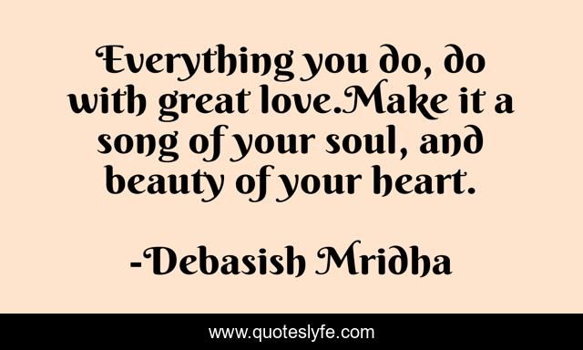 This page presents the quote "Everything you do, do with great love.Make it a song of your soul, and beauty of your heart.". Author of this quote is Debasish Mridha. This quote is about life, love, knowledge, inspirational, intelligence, philosophy, wisdom, quotes, affection,.