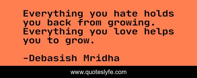 This page presents the quote "Everything you hate holds you back from growing. Everything you love helps you to grow.". Author of this quote is Debasish Mridha. This quote is about love-and-hate, philosophy, debasish-mridha, hat-holdys-you-back-from-growing, quotes, hate-and-love, debasish-mridha-md, inspirational, enthusiasm,.