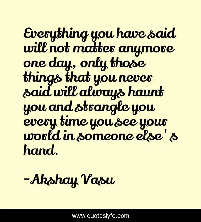 This page presents the quote "Everything you have said will not matter anymore one day, only those things that you never said will always haunt you and strangle you every time you see your world in someone else's hand.". Author of this quote is Akshay Vasu. This quote is about said, always, memories, haunt, broken, wishes, words, time, world,.