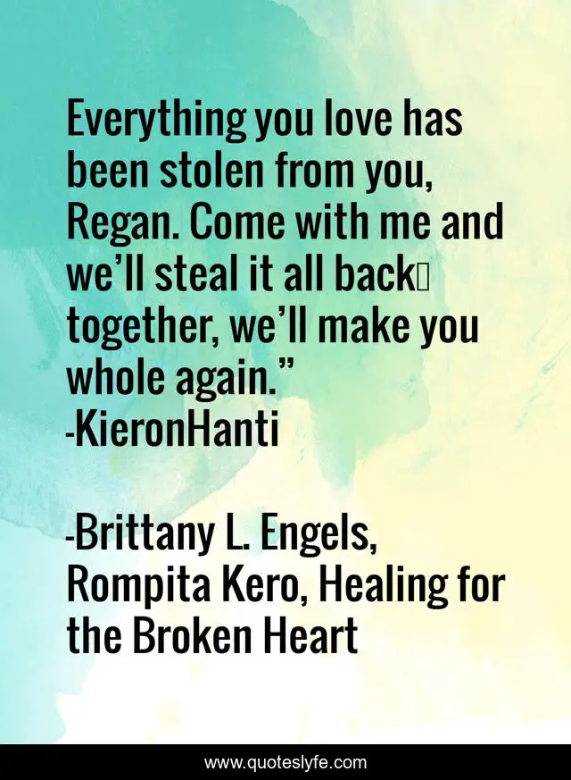 This page presents the quote "Everything you love has been stolen from you, Regan. Come with me and we’ll steal it all back… together, we’ll make you whole again.” -KieronHanti". Author of this quote is Brittany L. Engels, Rompita Kero, Healing for the Broken Heart. This quote is about enemy, life, stolen, love, dark, broken, affection,.