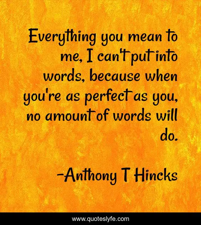 This page presents the quote "Everything you mean to me, I can't put into words, because when you're as perfect as you, no amount of words will do.". Author of this quote is Anthony T Hincks. This quote is about perfect, love, mean-to-me, philosophy, everything, amount, words, affection,.