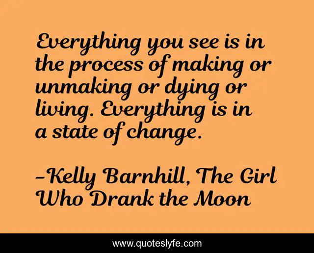 This page presents the quote "Everything you see is in the process of making or unmaking or dying or living. Everything is in a state of change.". Author of this quote is Kelly Barnhill, The Girl Who Drank the Moon. This quote is about life, chaos, change, order,.
