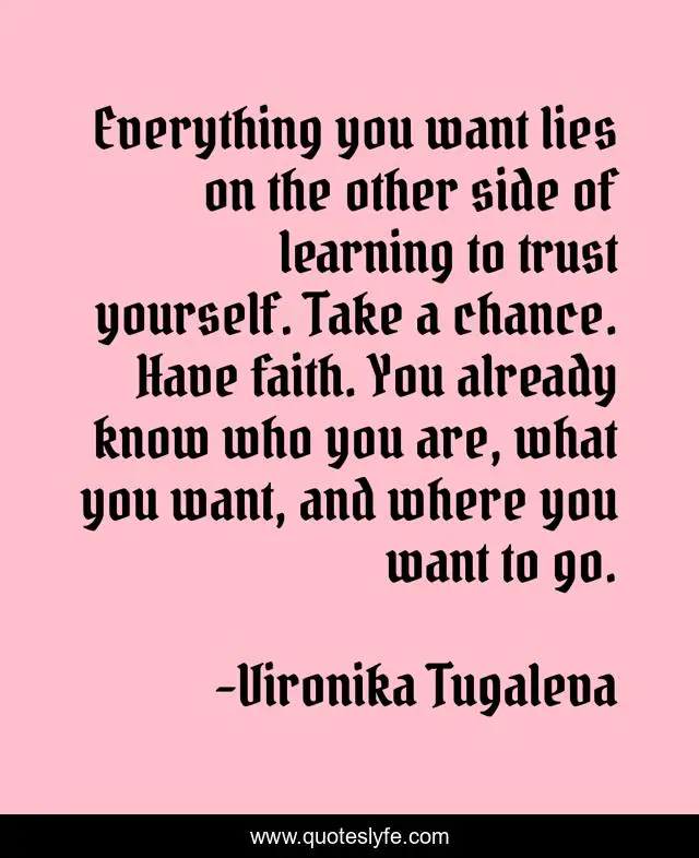 This page presents the quote "Everything you want lies on the other side of learning to trust yourself. Take a chance. Have faith. You already know who you are, what you want, and where you want to go.". Author of this quote is Vironika Tugaleva. This quote is about faith, self-love, trust, trust-yourself, taking-chances,.