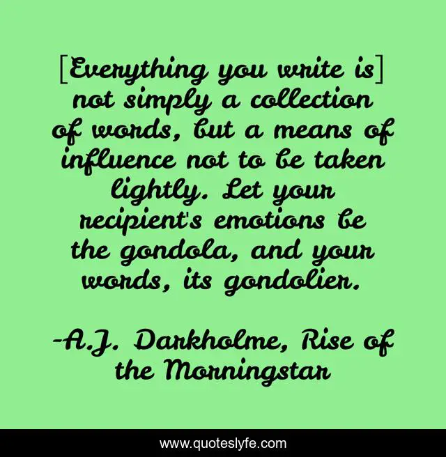 This page presents the quote "[Everything you write is] not simply a collection of words, but a means of influence not to be taken lightly. Let your recipient's emotions be the gondola, and your words, its gondolier.". Author of this quote is A.J. Darkholme, Rise of the Morningstar. This quote is about relationships, gains, power, people, communication, manipulation, influence, focus, emotions,.