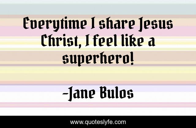 This page presents the quote "Everytime I share Jesus Christ, I feel like a superhero!". Author of this quote is Jane Bulos. This quote is about jesus-christ, faith, bible, christian, belief, love, heart, travel, hope,.