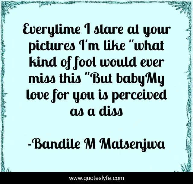 This page presents the quote "Everytime I stare at your pictures I'm like "what kind of fool would ever miss this "But babyMy love for you is perceived as a diss". Author of this quote is Bandile M Matsenjwa. This quote is about setting-dawn-of-love, love, affection,.