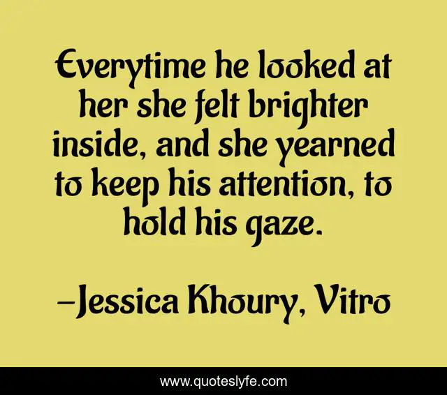 This page presents the quote "Everytime he looked at her she felt brighter inside, and she yearned to keep his attention, to hold his gaze.". Author of this quote is Jessica Khoury, Vitro. This quote is about love, look, attention, vitro, gaze, scifi, affection,.