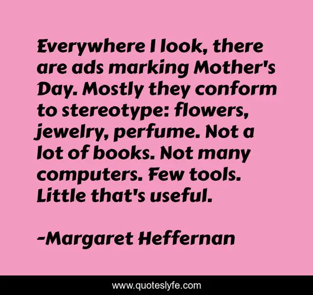 This page presents the quote "Everywhere I look, there are ads marking Mother's Day. Mostly they conform to stereotype: flowers, jewelry, perfume. Not a lot of books. Not many computers. Few tools. Little that's useful.". Author of this quote is Margaret Heffernan. This quote is about flowers, day, mother,.