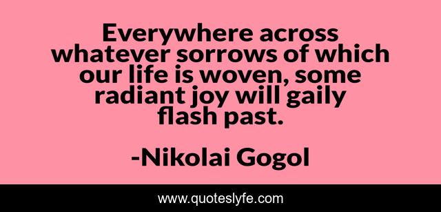 This page presents the quote "Everywhere across whatever sorrows of which our life is woven, some radiant joy will gaily flash past.". Author of this quote is Nikolai Gogol. This quote is about past, joy, life,.