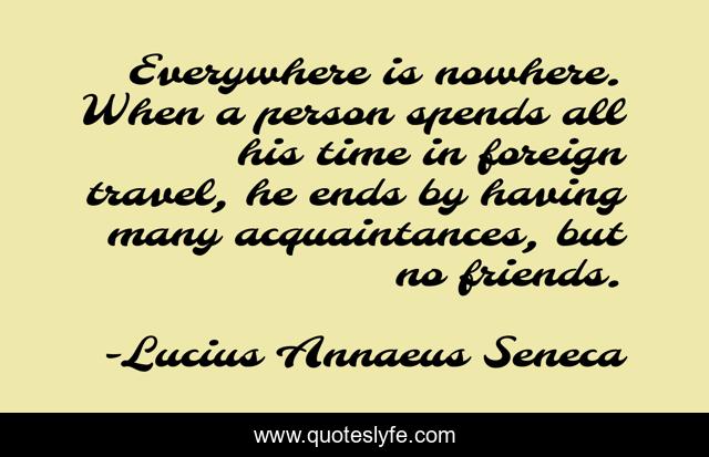 This page presents the quote "Everywhere is nowhere. When a person spends all his time in foreign travel, he ends by having many acquaintances, but no friends.". Author of this quote is Lucius Annaeus Seneca. This quote is about person, friends, time,.
