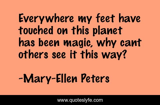 This page presents the quote "Everywhere my feet have touched on this planet has been magic, why cant others see it this way?". Author of this quote is Mary-Ellen Peters. This quote is about environment, love, affection, nature,.