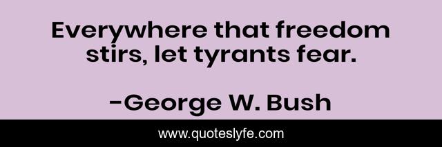 This page presents the quote "Everywhere that freedom stirs, let tyrants fear.". Author of this quote is George W. Bush. This quote is about tyrants, freedom, everywhere,.