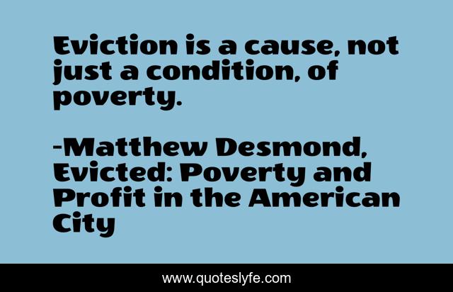 This page presents the quote "Eviction is a cause, not just a condition, of poverty.". Author of this quote is Matthew Desmond, Evicted: Poverty and Profit in the American City. This quote is about eviction, poverty,.