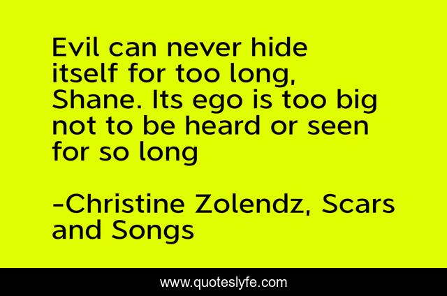This page presents the quote "Evil can never hide itself for too long, Shane. Its ego is too big not to be heard or seen for so long". Author of this quote is Christine Zolendz, Scars and Songs. This quote is about shane, life, scars-and-songs, grace, evil,.