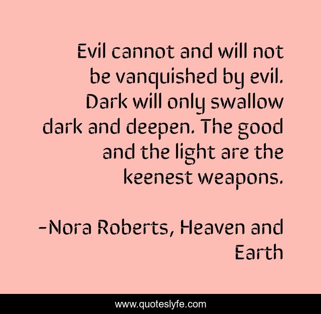 This page presents the quote "Evil cannot and will not be vanquished by evil. Dark will only swallow dark and deepen. The good and the light are the keenest weapons.". Author of this quote is Nora Roberts, Heaven and Earth. This quote is about good-and-evil, darkness-and-light, evil,.