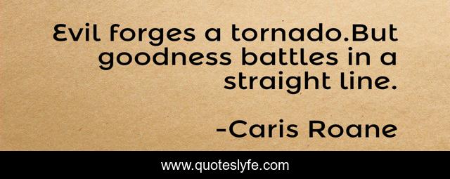 This page presents the quote "Evil forges a tornado.But goodness battles in a straight line.". Author of this quote is Caris Roane. This quote is about ascension, good, good-and-evil, evil,.