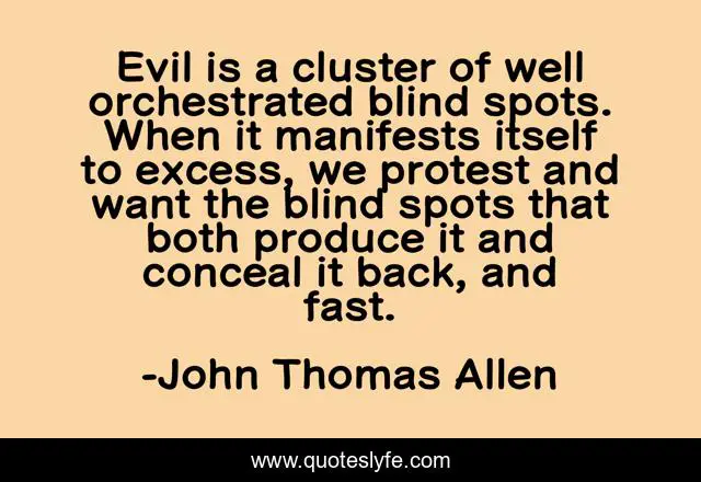 This page presents the quote "Evil is a cluster of well orchestrated blind spots. When it manifests itself to excess, we protest and want the blind spots that both produce it and conceal it back, and fast.". Author of this quote is John Thomas Allen. .