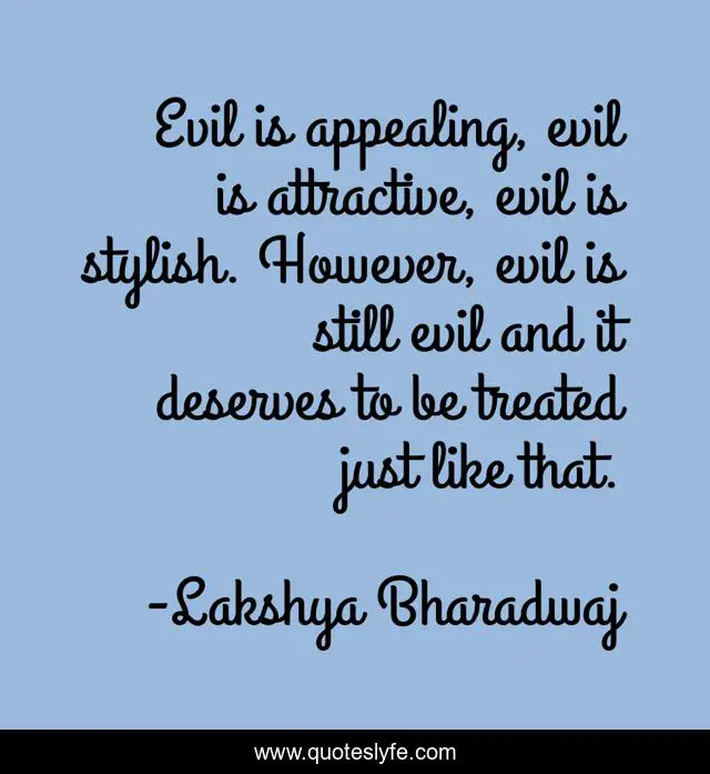This page presents the quote "Evil is appealing, evil is attractive, evil is stylish. However, evil is still evil and it deserves to be treated just like that.". Author of this quote is Lakshya Bharadwaj. This quote is about reality-of-life, treating-others, attractiveness, life, evil, reality, appealing,.