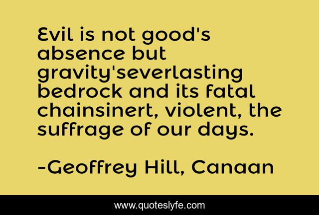 This page presents the quote "Evil is not good's absence but gravity'severlasting bedrock and its fatal chainsinert, violent, the suffrage of our days.". Author of this quote is Geoffrey Hill, Canaan. .