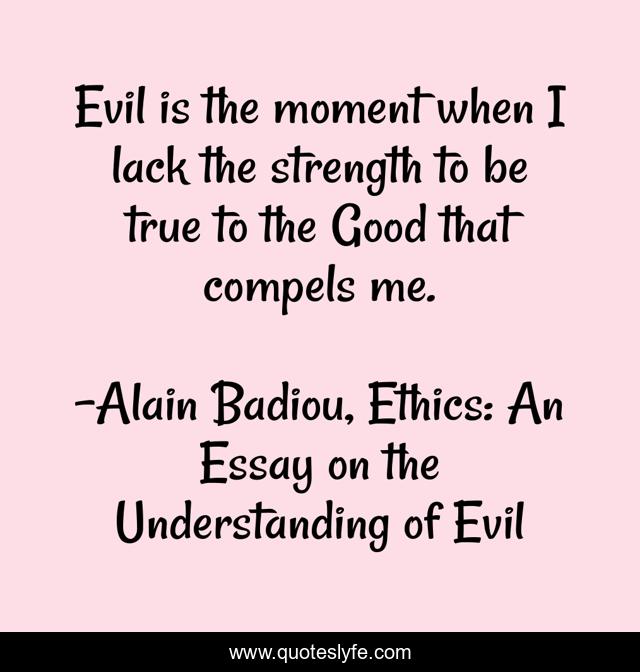 This page presents the quote "Evil is the moment when I lack the strength to be true to the Good that compels me.". Author of this quote is Alain Badiou, Ethics: An Essay on the Understanding of Evil. This quote is about strength, good, compulsion, evil,.