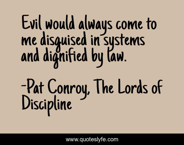 This page presents the quote "Evil would always come to me disguised in systems and dignified by law.". Author of this quote is Pat Conroy, The Lords of Discipline. This quote is about coercion, law, conformity,.