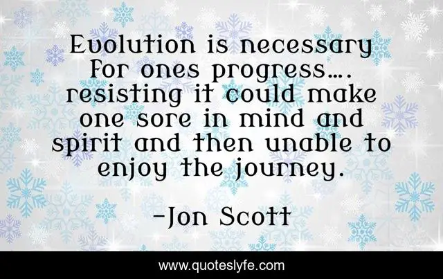 This page presents the quote "Evolution is necessary for ones progress…. resisting it could make one sore in mind and spirit and then unable to enjoy the journey.". Author of this quote is Jon Scott. This quote is about enthusiasm, change, inspirational,.
