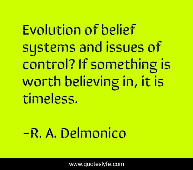 This page presents the quote "Evolution of belief systems and issues of control? If something is worth believing in, it is timeless.". Author of this quote is R. A. Delmonico. This quote is about timeless, belief,.