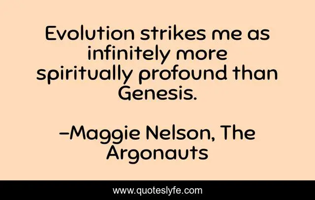 This page presents the quote "Evolution strikes me as infinitely more spiritually profound than Genesis.". Author of this quote is Maggie Nelson, The Argonauts. This quote is about evolution, genesis,.
