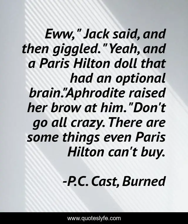 This page presents the quote "Eww, " Jack said, and then giggled. "Yeah, and a Paris Hilton doll that had an optional brain."Aphrodite raised her brow at him. "Don't go all crazy. There are some things even Paris Hilton can't buy.". Author of this quote is P.C. Cast, Burned. .