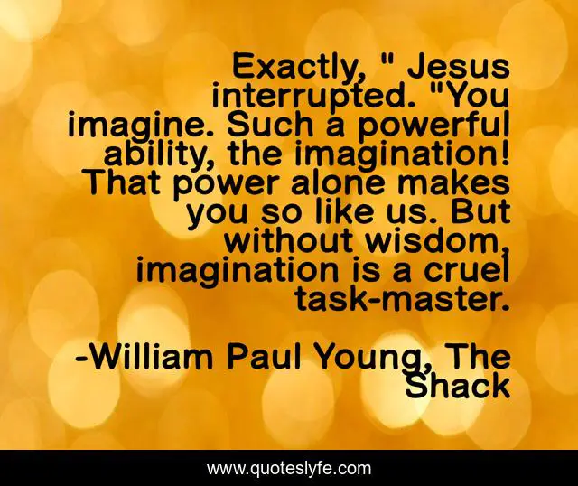 This page presents the quote "Exactly, " Jesus interrupted. "You imagine. Such a powerful ability, the imagination! That power alone makes you so like us. But without wisdom, imagination is a cruel task-master.". Author of this quote is William Paul Young, The Shack. .