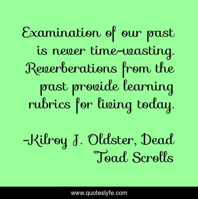 This page presents the quote "Examination of our past is never time-wasting. Reverberations from the past provide learning rubrics for living today.". Author of this quote is Kilroy J. Oldster, Dead Toad Scrolls. This quote is about self-reflection, learning-from-mistakes, learning-from-our-struggles, memories, learning, learning-from-the-past, memoir, learning-from-experiences,.