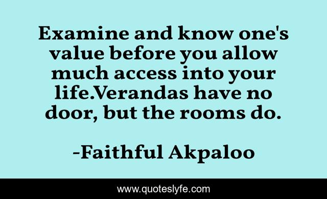This page presents the quote "Examine and know one's value before you allow much access into your life.Verandas have no door, but the rooms do.". Author of this quote is Faithful Akpaloo. This quote is about relationship, value,.