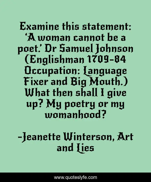 This page presents the quote "Examine this statement: ‘A woman cannot be a poet.’ Dr Samuel Johnson (Englishman 1709-84 Occupation: Language Fixer and Big Mouth.) What then shall I give up? My poetry or my womanhood?". Author of this quote is Jeanette Winterson, Art and Lies. .