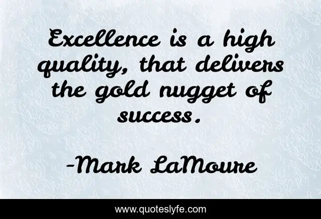 This page presents the quote "Excellence is a high quality, that delivers the gold nugget of success.". Author of this quote is Mark LaMoure. This quote is about self-confidence, uplifting, success, excellent-people, excellence, self-improvement, inspirational, self-help, determination,.
