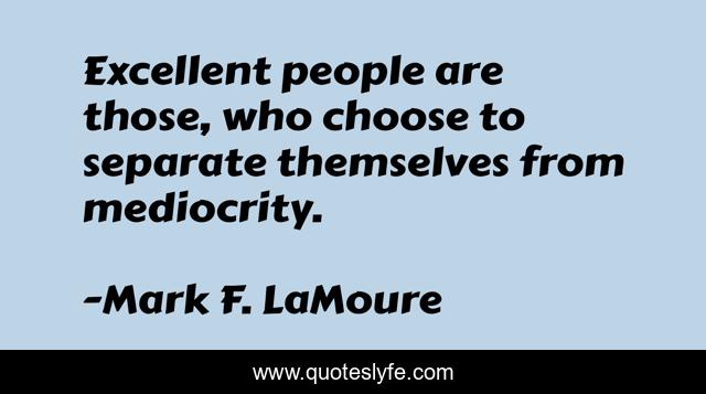 This page presents the quote "Excellent people are those, who choose to separate themselves from mediocrity.". Author of this quote is Mark F. LaMoure. This quote is about confidence, positive, excellence, self-improvement, inspirational, self-help, self-motivation, determination, enthusiasm,.