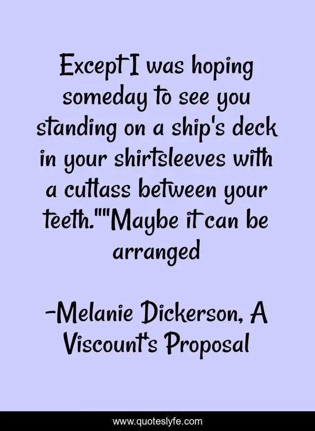 This page presents the quote "Except I was hoping someday to see you standing on a ship's deck in your shirtsleeves with a cutlass between your teeth.""Maybe it can be arranged". Author of this quote is Melanie Dickerson, A Viscount's Proposal. This quote is about love, historical-romance, affection,.