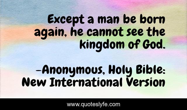 This page presents the quote "Except a man be born again, he cannot see the kingdom of God.". Author of this quote is Anonymous, Holy Bible: New International Version. This quote is about spiritual, bible, the-holy-bible, jesus,.