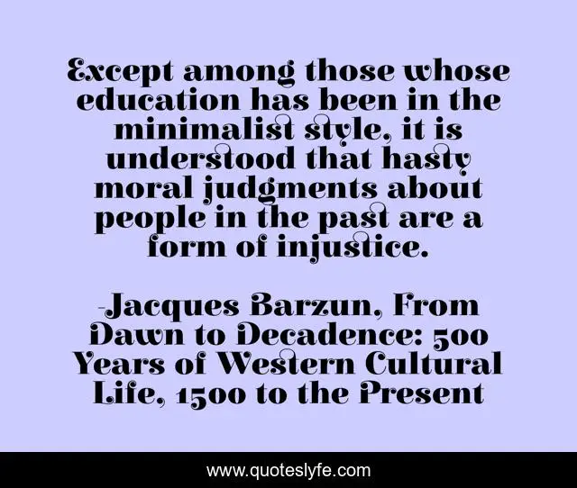 This page presents the quote "Except among those whose education has been in the minimalist style, it is understood that hasty moral judgments about people in the past are a form of injustice.". Author of this quote is Jacques Barzun, From Dawn to Decadence: 500 Years of Western Cultural Life, 1500 to the Present. This quote is about education, history, insult,.