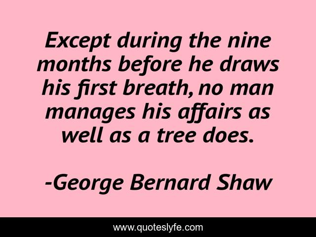 This page presents the quote "Except during the nine months before he draws his first breath, no man manages his affairs as well as a tree does.". Author of this quote is George Bernard Shaw. This quote is about man, tree, first,.