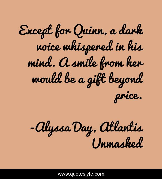 This page presents the quote "Except for Quinn, a dark voice whispered in his mind. A smile from her would be a gift beyond price.". Author of this quote is Alyssa Day, Atlantis Unmasked. This quote is about alyssa, day,.