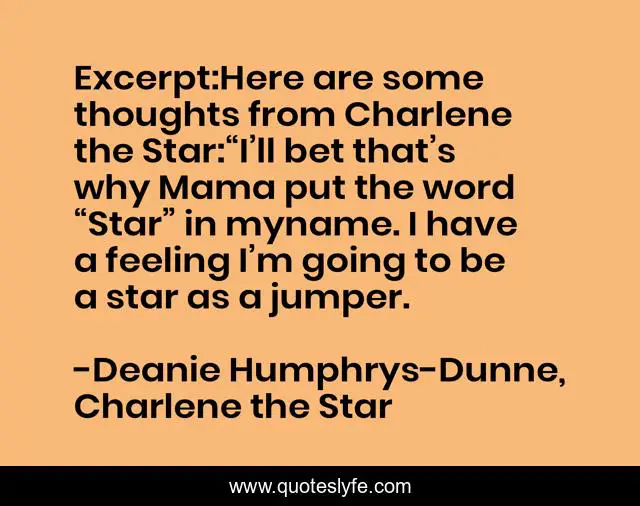 This page presents the quote "Excerpt:Here are some thoughts from Charlene the Star:“I’ll bet that’s why Mama put the word “Star” in myname. I have a feeling I’m going to be a star as a jumper.". Author of this quote is Deanie Humphrys-Dunne, Charlene the Star. This quote is about horses, humor, kids, racing,.