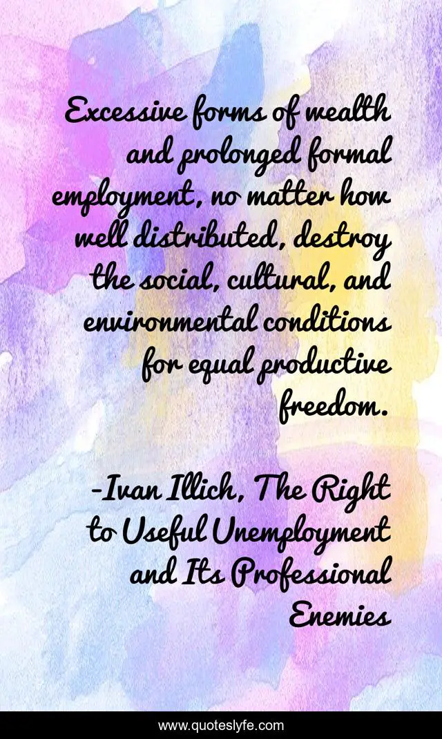 This page presents the quote "Excessive forms of wealth and prolonged formal employment, no matter how well distributed, destroy the social, cultural, and environmental conditions for equal productive freedom.". Author of this quote is Ivan Illich, The Right to Useful Unemployment and Its Professional Enemies. This quote is about freedom, employment, wealth,.
