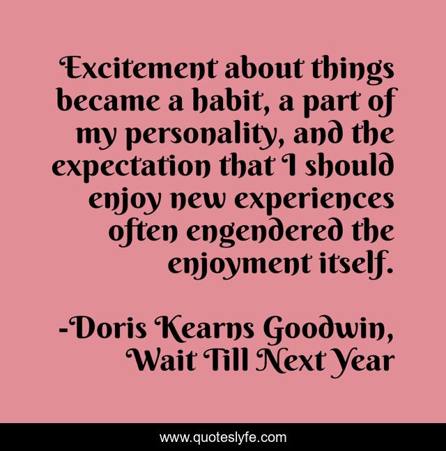 This page presents the quote "Excitement about things became a habit, a part of my personality, and the expectation that I should enjoy new experiences often engendered the enjoyment itself.". Author of this quote is Doris Kearns Goodwin, Wait Till Next Year. This quote is about character, parenthood, curiosity, enthusiasm, cheerfulness, personality,.