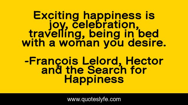 This page presents the quote "Exciting happiness is joy, celebration, travelling, being in bed with a woman you desire.". Author of this quote is François Lelord, Hector and the Search for Happiness. This quote is about joy, travelling, exciting, happiness, celebration,.