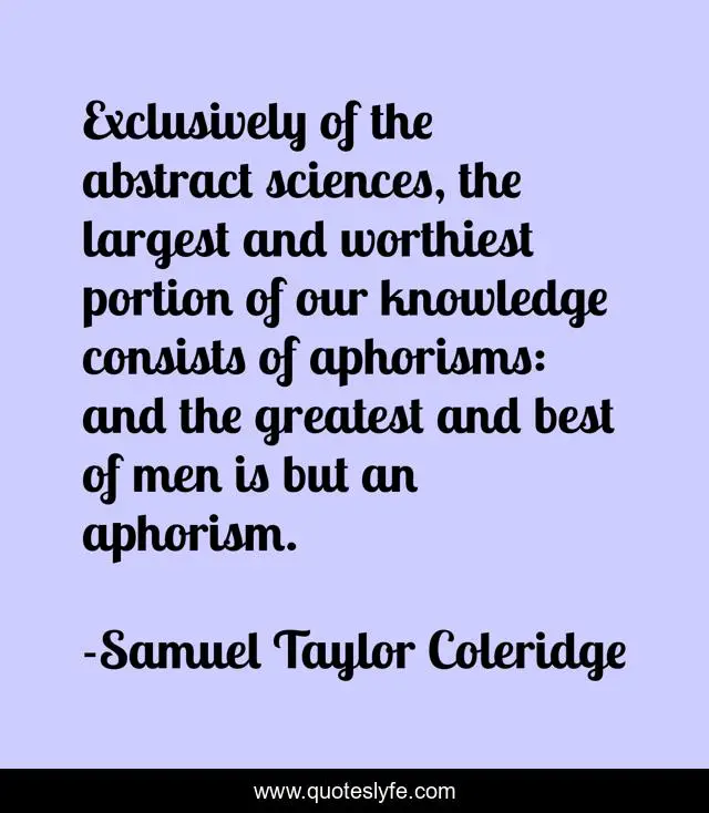 This page presents the quote "Exclusively of the abstract sciences, the largest and worthiest portion of our knowledge consists of aphorisms: and the greatest and best of men is but an aphorism.". Author of this quote is Samuel Taylor Coleridge. This quote is about men, greatest, best,.