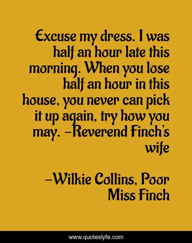 This page presents the quote "Excuse my dress. I was half an hour late this morning. When you lose half an hour in this house, you never can pick it up again, try how you may. -Reverend Finch's wife". Author of this quote is Wilkie Collins, Poor Miss Finch. This quote is about motherhood, humor,.